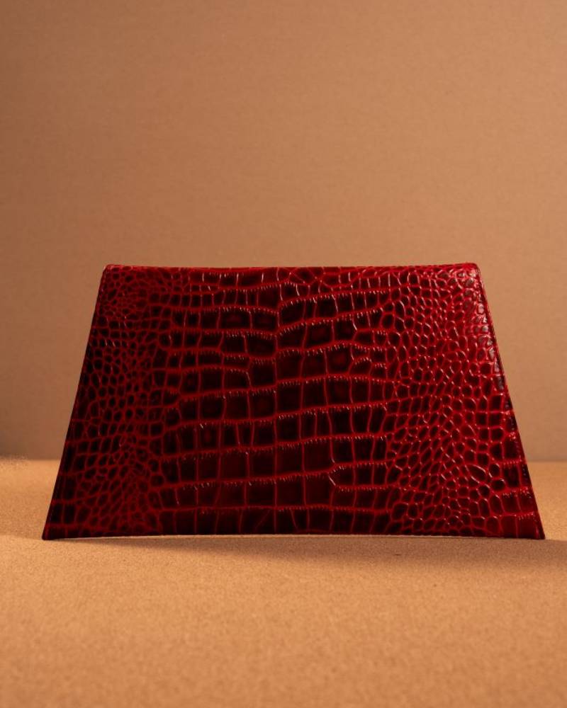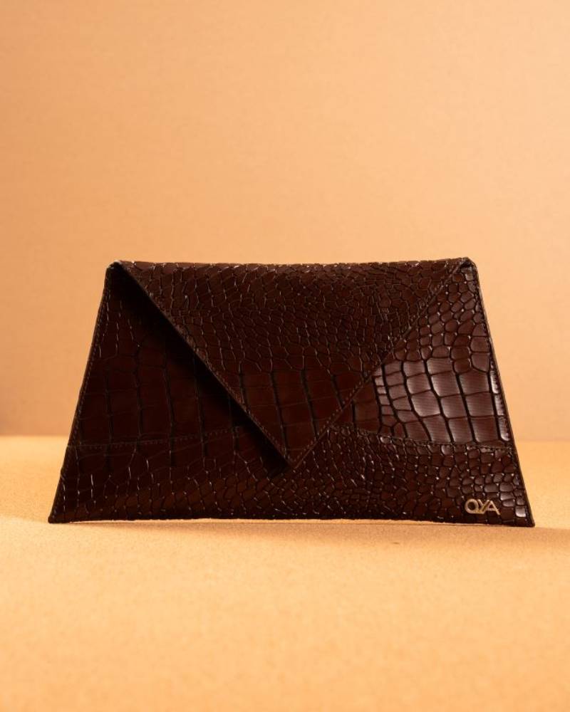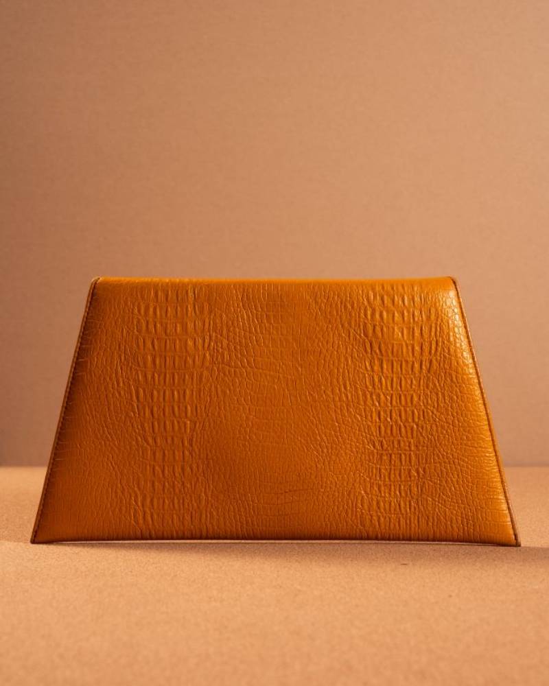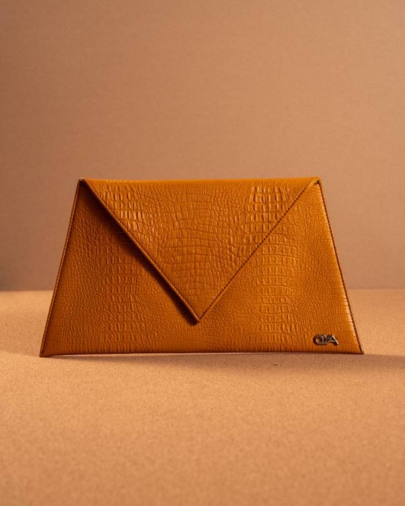The Envelope Clutch is a sleek and stylish accessory, crafted with a rich, textured faux crocodile leather that adds a touch of sophistication to any outfit. Its triangular flap closure gives it an elegant, geometric look, while the clean lines and subtle embossing elevate its minimalist design. The warm, caramel color enhances its versatile appeal, making it the perfect addition for both day and evening events. The clutch is finished with a small, elegant logo at the corner, ensuring a polished and high-end feel. Ideal for holding essentials, the Envelope Clutch is both chic and function.